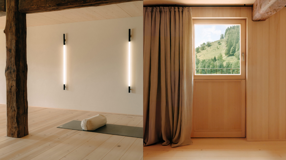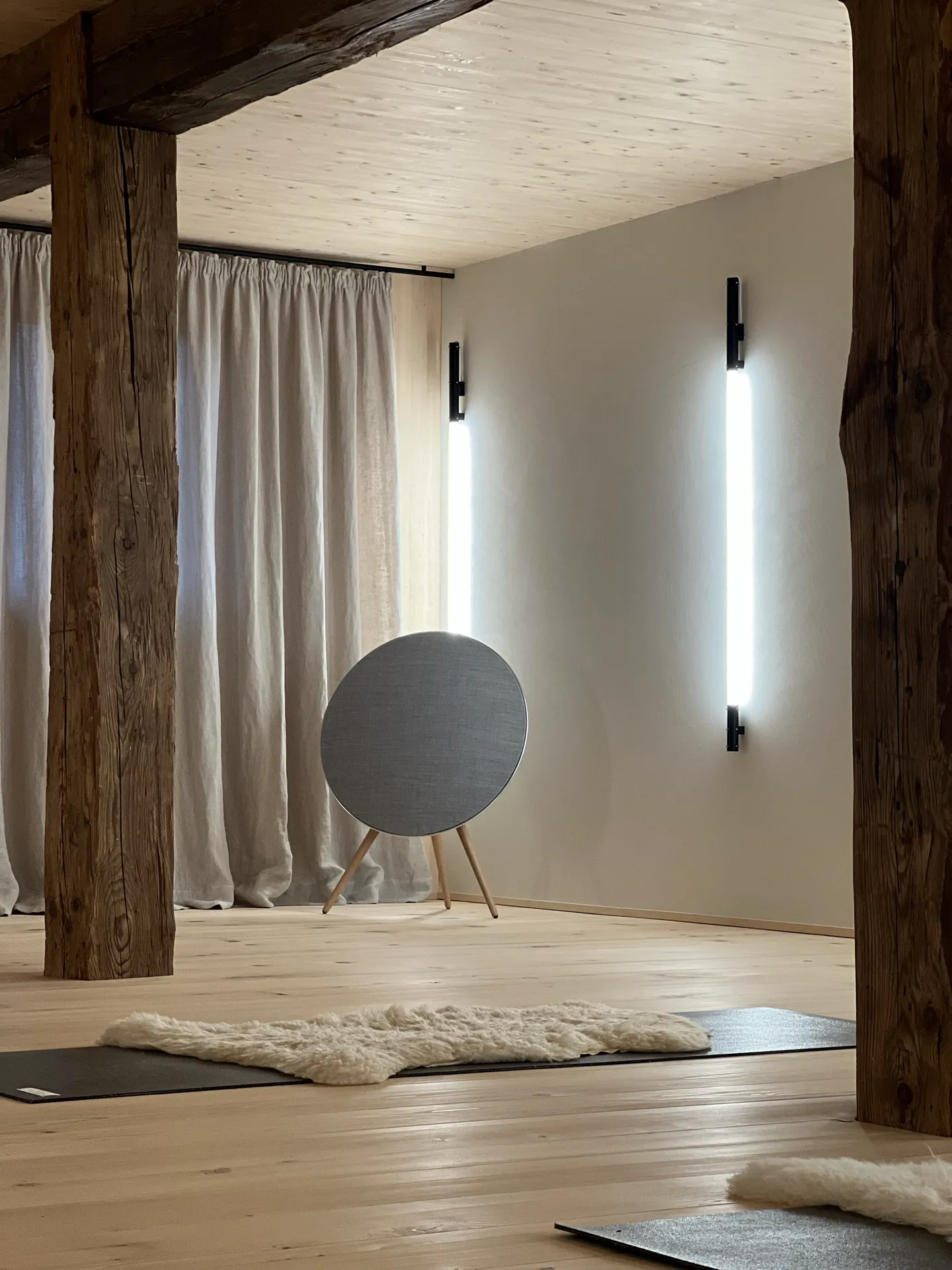 Der Yoga/Meditationsraum ist ein separater, lichtdurchfluteter Raum mit Südausrichtung. Er ist mit Weisstanne (Boden, Wände) und natürlichem Lehmputz an den Wänden verkleidet. Ausgestattet mit Yogamatten, Kissen, NOHRD-Fitnessgeräten und einem B&O-Soundsystem.