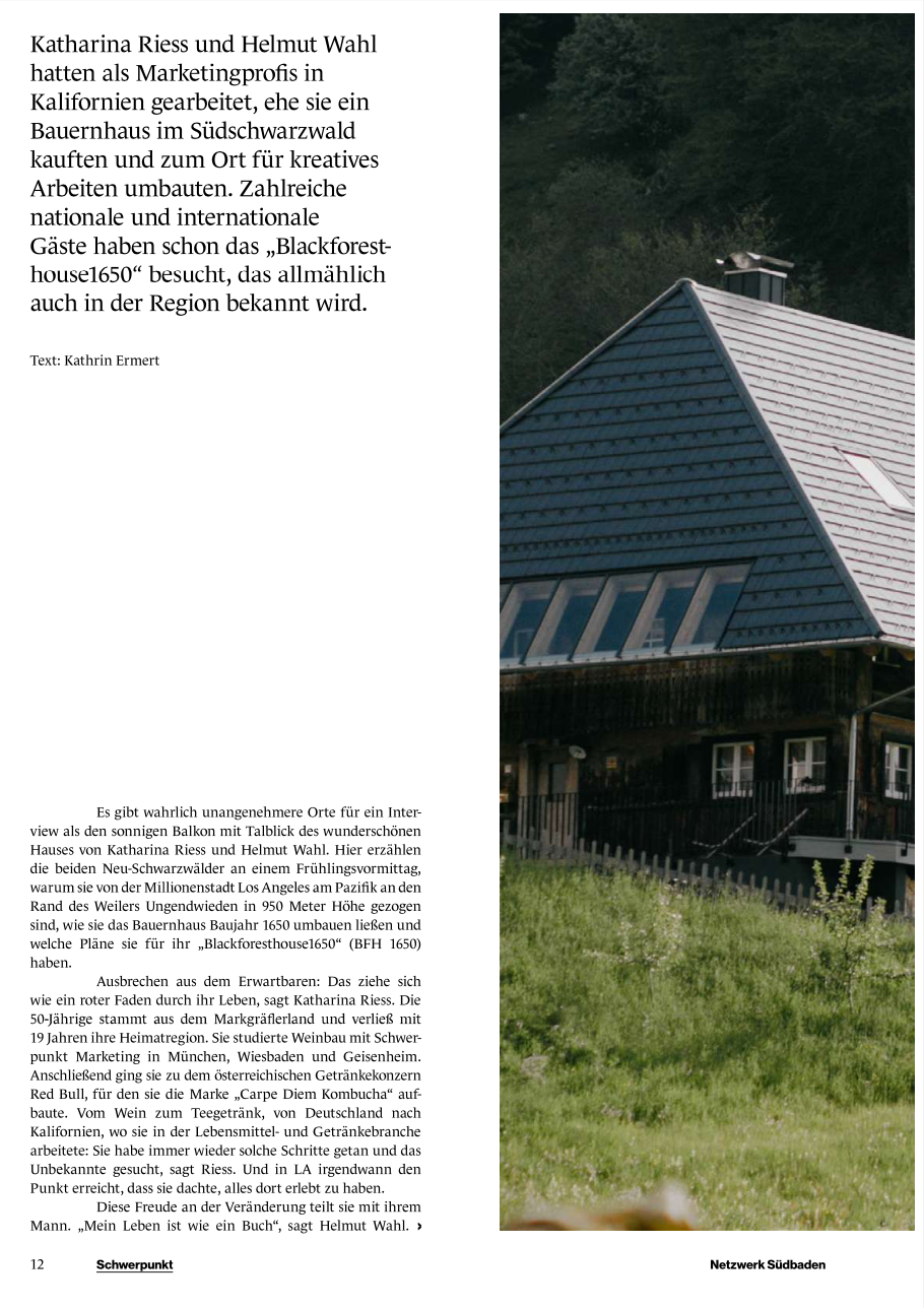 Unsere Geschichte von der Corporate World in den Wald und unsere Vision hinter @BFH1650 – die Transformation eines traditionellen Schwarzwälder Bauernhauses in einen modernen Hub für Kreativität, Gemeinschaft, Reflexion und Experimentierfreude. "Wir wollten erleben, was das Leben auf einem Bauernhof in der heutigen Zeit bedeuten kann und wie wir beide Welten (Los Angeles und Schwarzwald) in unserem Leben verknüpfen können". Unsere Absicht war es nie eine Ort zu kreieren um der Realität zu entfliehen, sondern vielmehr einen Ort zu schaffen, der Werte vermittelt, der zum Entdecken anregt und die Reise zu Erneuerung und Verbundenheit ermöglicht. „Wir kreieren Erlebnisse und bringen Menschen zusammen – Entdecken statt Konsumieren.“